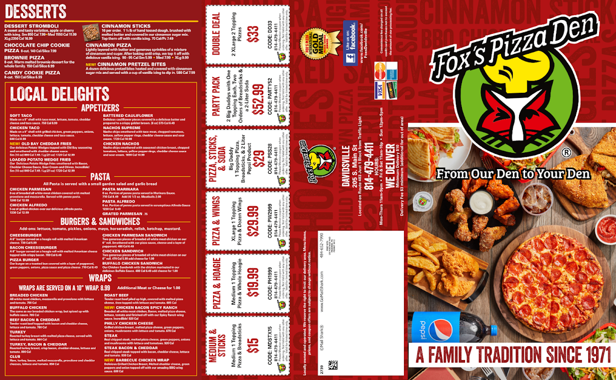 Welcome to Fox's Pizza Den - Davidsville, a delightful culinary gem nestled in the heart of Davidsville, PA. Offering an extensive menu that caters to every palate, this establishment is renowned for its mouthwatering pizza, delectable hoagies, and satisfying appetizers. From the hearty Loaded Potato Wedge Fries to the bold flavors of Chicken Nachos, each dish promises to tantalize your taste buds.